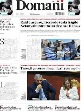 - “Raid e accuse, l’accordo resta fragile” tra Israele e Hamas. Blinken esorta: “Il cessate il fuoco parta domenica”. E Biden attacca Trump: “Democrazia a rischio”. Spazio alle tasse: “il governo dimentica il ceto medio” in riferimento alla promessa rimasta tale di Tajani di tagliare l’Irpef. Restando all’estero, l’analisi di Joschka Fischer: tra Trump e Putin restano “Ucraina e Siria, per l’Europa tempi durissimi”