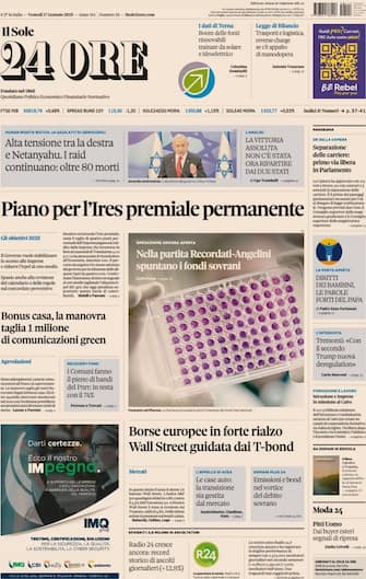 - Piano del Governo e obiettivo del 2025 in apertura del quotidiano economico: “piano per l’Ires premiale permanente”, stabilizzazione dello sconto alle imprese e riduzione dell’Irpef al ceto medio tra le priorità. Spazio poi alle aziende farmaceutiche italiane che attirano l'attenzione dei fondi internazionali: è ancora aperta la partita Recordati-Angelini, tra cui spuntano i fondi sovrani. In taglio basso i mercati: Borse europee in forte rialzo con Wall Street guidata dai T Bond