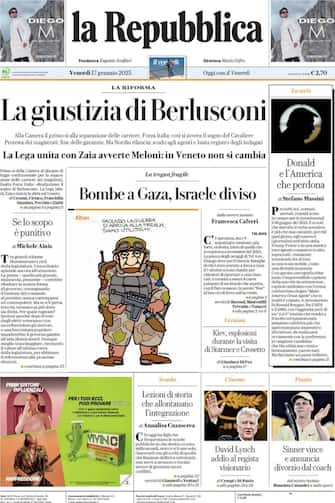 - “La giustizia di Berlusconi” è il titolo del quotidiano che apre la prima pagina sul tema della separazione delle carriere dopo il primo sì di ieri alla Camera. Protestano i magistrati, per i quali si tratta della “fine delle garanzie”; esultano invece da Forza Italia: “Così si avvera il sogno del Cavaliere”. A centro pagine la “tregua fragile” a Gaza: il racconto tra “speranza e tensione” dell’inviata da Tel Aviv. Uno sguardo sulla scuola con l’articolo in taglio basso di Annalisa Cuzzocrea: “Lezioni di storia che allontanano l’integrazione