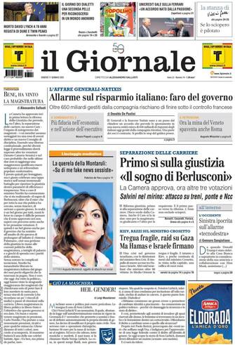 - Apertura di quotidiano dedicata all’affare Generali-Naxitis: “Allarme sul risparmio italiano: faro del governo” perché oltre 650 miliardi gestiti dalla compagnia rischiano di finire sotto il controllo francese. Giustizia: arriva il primo sì alla Camera per la riforma sulla separazione delle carriere. Sul tema anche l’editoriale di Alessandro Sallusti: “ha vinto la magistratura” per il direttore del quotidiano che parla di liberazione delle toghe dal “giogo dei pochi oligarchi che la tenevano in pugno”