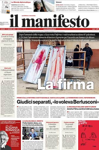 - Una foto di due barelle insanguinate e il titolo “La firma” al centro della prima pagina del quotidiano: dopo l’annuncio della tregua a Gaza resta l’inferno e a Tel Aviv è crisi nel governo con l’ultradestra che minaccia di lasciare e fa slittare il voto decisivo. E nelle dinamiche si inserisce il ruolo decisivo di Trump che “scompagina i falchi di Tel Aviv”. Primo sì alla riforma costituzionale sulla separazione delle carriere. La gioia di Forza Italia: “Lo voleva Berlusconi”