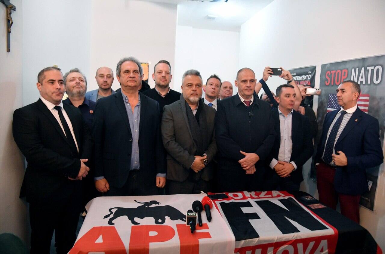 Volantini con la croce celtica, nessun saluto romano ma saluti gladiatori con la presa dell'avambraccio. Nella sede di Forza Nuova di via Genzano a Roma, 'presidiata' da militanti e forze dell'ordine, il raduno dei neofascisti europei. I messaggi lanciati da Roberto Fiore, leader di Fn, alla conferenza stampa di APF (Alliance for Peace and Freedom) sono chiari: contro l'attuale governo, "antisionista", pro-Trump, ma con un'avversione per Musk, ripristino dell'articolo 18 per abbattere il precariato in Italia. "Siamo qui per rilanciare Apf. Significa attività, elezioni, ma soprattutto riprendere piede su tutto il territorio europeo con attività", ha detto Fiore. Dopo il dietrofront dell'hotel in zona Termini, la riunione con i vari gruppi dell'estrema destra europea è avvenuta ieri fuori Roma, e oggi l'incontro nella sede di FN nella Capitale, a via Genzano. All'iniziativa hanno aderito da Falange e Democracia Nacional (Spagna) a Le Nationalistes (Francia), da Serbian Right (Serbia) a Heimat (Germania) fino a K21 (Grecia), Noua Dreapta (Romania) e SSNP (Siria).