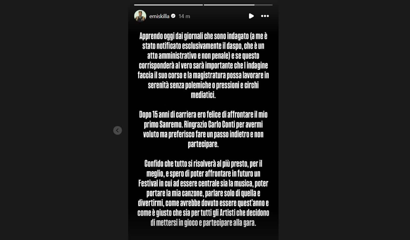 Dopo aver appreso "dai giornali" di essere indagato, Emis Killa rinuncia a partecipare al festival di Sanremo: "Dopo 15 anni di carriera ero pronto ad affrontare il mio primo Sanremo. Ringrazio Carlo Conti per avermi voluto ma preferisco fare un passo indietro e non partecipare", annuncia lo stesso rapper nelle stories di Instagram. "Apprendo oggi dai giornali che sono indagato (a me è stato notificato esclusivamente il daspo, che è un atto amministrativo e non penale) e se questo corrisponderà al vero sarà importante che l'indagine faccia il suo corso e la magistratura possa lavorare in serenità senza polemiche o pressioni e circhi mediatici", aggiunge Emis Killa. Il direttore artistico Carlo Conti e l'organizzazione del Festival, spiega una nota di Viale Mazzini, "prendono atto del ritiro di Emis Killa dalla 75 edizione del Festival di Sanremo. Di conseguenza Rai informa che la gara si svolgerà con la presenza di 29 artisti sul palco del Teatro Ariston" e quindi Emis Killa non sarà sostituito.