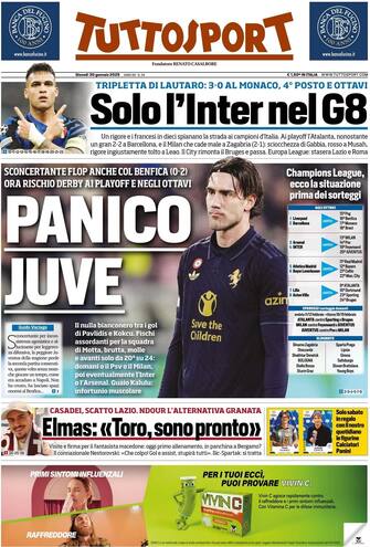 - In primo piano il trionfo dell’Inter e la tripletta di Lautaro: “Solo l’Inter nel G8. Tripletta di Lautaro: 3-0 al Monaco, 4° posto e ottavi”. E ancora “Panico Juve. Sconcertante flop anche col Benfica (0-2) ora rischio derby ai playoff e negli ottavi”. “Campions League, ecco la situazione prima dei sorteggi”