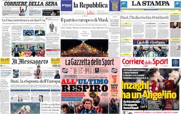 - "La Cina contrattacca sui dazi Usa" è il titolo d'apertura di oggi del Corriere della Sera sulla risposta di Pechino all'annuncio di dazi da parte degli Stati Uniti. Al centro, lo sport con il derby Milan-Inter a San Siro. Ancora Stati Uniti, con il lancio da parte di Elon Musk del movimento Mega (Make Europe Great Again"): "La Ue torni grande". Poi la cronaca, con il caso del ragazzo picchiato a Lanzarote: "Arrestato l'aggressore"