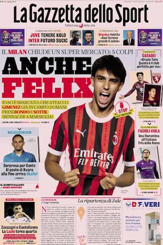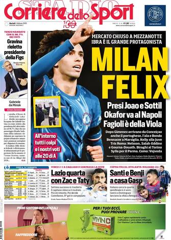 - 'Milan Felix' titola Il Corriere dello Sport con una foto a tutta pagina dell'asso portoghese, arrivato in prestito dal Chelsea. L'altro colpo di giornata è il passaggio alla Fiorentina dell'ormai ex juventino Nicolò Fagioli. Nel monday night la Lazio batte il Cagliari e si issa al quarto posto
