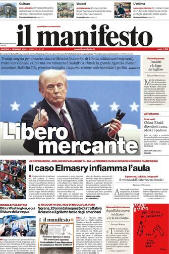 - 'Libero mercante' è il titolo scelto a tutta pagina dal Manifesto a corredo di una foto del presidente statunitense. Subito sotto, il caso Almasri che tiene ancora banco, con le opposizioni che continuano a chiedere l'intervento di Meloni in parlamento
