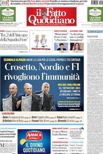 - Ancora il caso Almasri sulla prima del Fatto Quotidiano. 'Crosetto, Nordio e FI rivogliono l'immunità', scrive il quotidiano diretto da Marco Travaglio. Sul torturatore libico riferiranno due ministri la prossima settimana