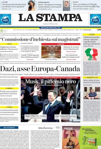 - Anche La Stampa punta su quello che viene definito 'asse Ue-Canada' per contrastare le mosse protezionistiche di Trump. Taglio alto per la proposta di Forza Italia, sostenuta da una larga fetta della maggioranza, che chiede una commissione d'inchiesta sui magistrati, mente sullo sfondo prosegue lo scontro innescato dal caso Almasri