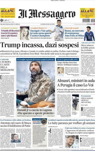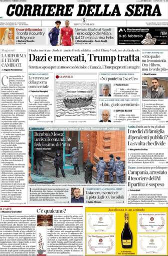 - Sono le conseguenze dei dazi imposti da Donald Trump ad aprire la gran parte dei quotidiani in edicola oggi. Il Corriere della Sera punta sulla sospensione della stretta per un mese con Messico e Canada, in cambio della presenza di 10mila soldati al confine. L'Europa, intanto, si dice pronta a reagire. A centro pagina fotonotizia dedicata all'attentato che Mosca ha portato all'uccisione di un comandante fedelissimo di Vladimir Putin