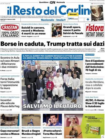- Si parla ancora di dazi anche sul Resto del Carlino, dove si pone l'accento anche sulle ripercussioni sui mercati, con le Borse in caduta libera. A centro pagina la visita di Papa Francesco al summit per i bambini rifugiati o vittime di guerre
