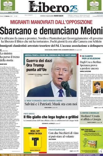 - Libero si scaglia contro quelli che vengono definiti 'migranti manovrati dall'opposizione' dopo la causa a Meloni, Nordio e Piantedosi per favoreggiamento. A centro pagina la guerra dei dazi, con Trump che ora punta all'Ue