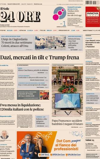 - 'Dazi, mercati in tilt e Trump frena' è il titolo scelto dal Sole 24 Ore. Taglio alto per il Medio Oriente, con l'Anp che denuncia la morte di 70 persone in due settimane di operazioni miliitari in Cisgiordania