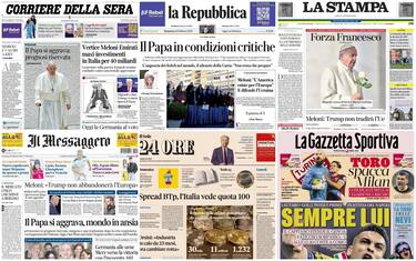 In apertura dei giornali l'aggravamento delle condizioni di salute di Papa Francesco, in prognosi riservata dopo la crisi respiratoria di ieri. Per Bergoglio necessari ossigeno e trasfusioni. Intervento della premier Meloni alla Convention della destra americana: "Trump non abbandonerà l'Europa. Ucraina vittima di una brutale aggressione". Gli Usa insistono sulle terre rare: "O Kiev firma l'accordo, o addio Starlink". Infine il voto in Germania: Cdu favorita, ma l'Afd la tallona