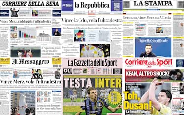Sulle prime pagine dei giornali i risultati delle elezioni in Germania con la vittoria della Cdu guidata da Friedrich Merz, l'ultradestra dell'Afd è secondo partito, mentre crolla l'Spd del cancelliere Olaf Scholz. Spazio anche all'annuncio del presidente ucraino Vlodymyr Zelensky che ha dichiarato di dimettersi "se l'Ucraina entra nella Nato". E ancora, le condizioni di Papa Francesco che restano critiche e i risultati del weekend calcistico in serie A
