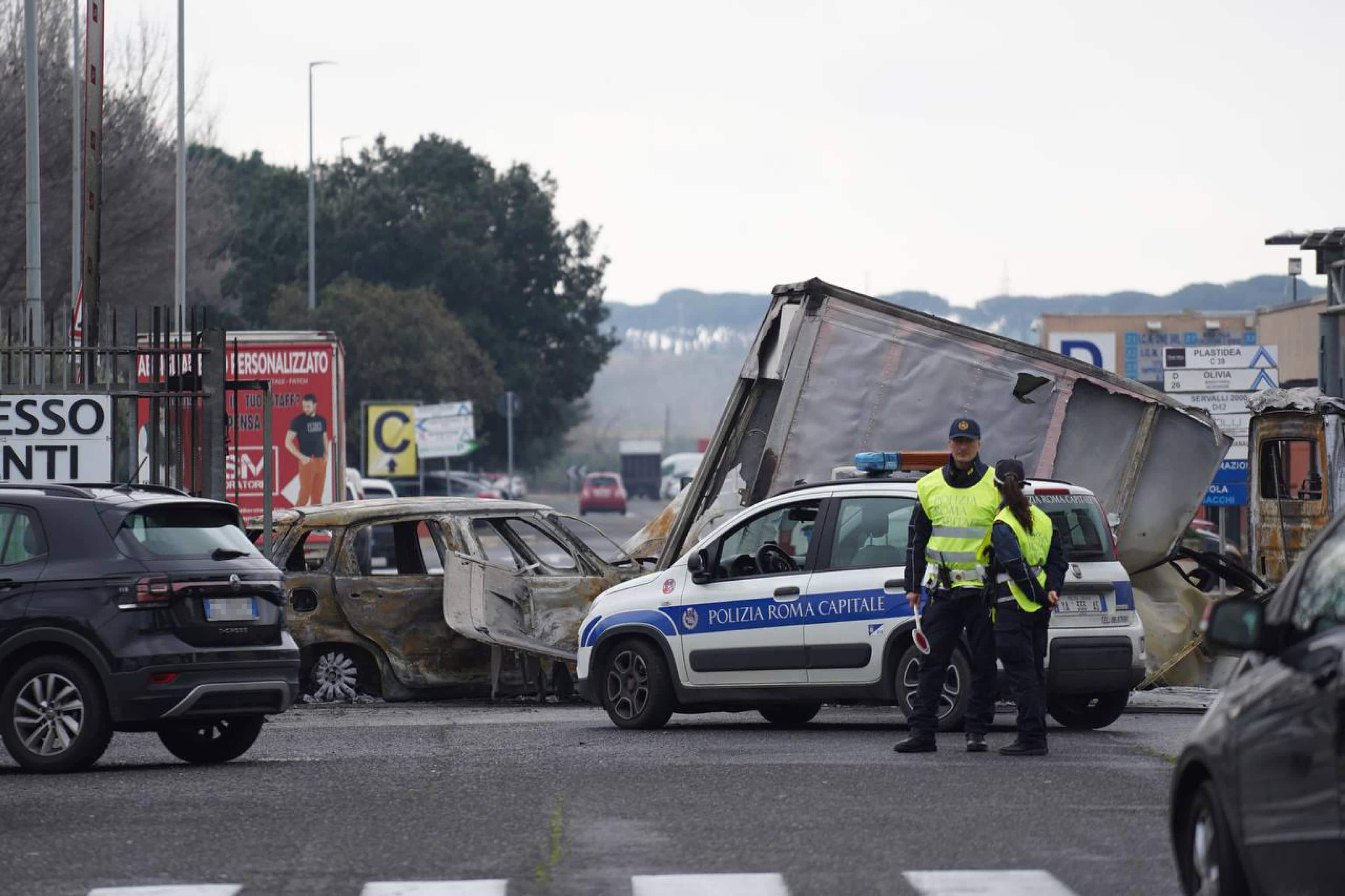Roma, colpo a ditta Edgar nel complesso Commercity: mezzi incendiati e chiodi su asfalto