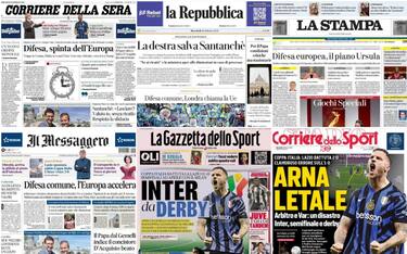La guerra in Ucraina, con le mosse dell'Europa in vista di una possibile tregua, le condizioni di Papa Francesco, ancora ricoverato al Gemelli di Roma, il caso Santanchè con la ministra che apre alle dimissioni in caso di processo e l'approdo dell'Inter alle semifinali di Coppa Italia. Questi alcuni dei temi principali presenti sulle prime pagine dei quotidiani, oggi in edicola