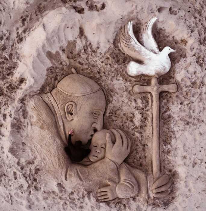 Una preghiera per Papa Francesco sulla sabbia è la nuova opera dell'artista Nicola Urru. Al quinto pettine della spiaggia di Platamona, Sassari, l’artista ha realizzato una mega scultura con l’immagine del Pontefice che abbraccia un bambino, e tiene in mano un pastorale a forma di croce, nella cui sommità siede una colomba. Un modo per stare vicino al Santo Padre ricoverato all'ospedale Gemelli di Roma e ancora in prognosi riservata. “Per essere grandi bisogna prima di tutto saper essere piccoli. L'umiltà è la base di ogni vera grandezza” scrive Urru sui social per spiegare la sua opera.
