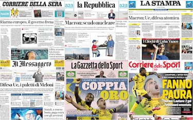 - Repubblica apre con "Macron: scudo nucleare" dopo che il presidente francese ha "offerto l'ombrello atomico contro Putin". Il governo "si spacca" sul riarmo dell'Europa, Giorgetti si dice contrario. Spazio alla questione dazi imposti da Trump ai prodotti canadesi e messicani: "La Casa Bianca rinvia di un mese i dazi sulle auto". In prima pagina anche l'inchiesta sull'urbanistica a Milano con la decisione del sindaco Giuseppe Sala: "Stop al Salva Milano". Addio al giornalista sportivo Bruno Pizzul