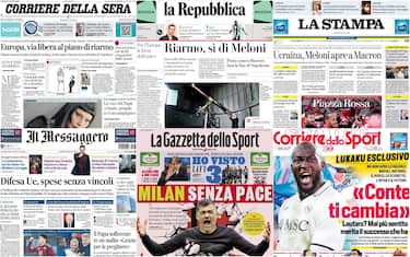È sempre il piano di riarmo dell'Unione europea a tenere banco sulle aperture dei giornali in edicola oggi. Col sì di Meloni arriva il via libera di Bruxelles, ma la premier italiana avvisa: "Non si usino i fondi di coesione". Putin, intanto, minaccia Macron: "Farà la fine di Napoleone". In evidenza anche le prime parole di Papa Francesco dal ricovero al Gemelli, trasmesse in un audio a San Pietro. Spazio, infine, al taglio dei tassi della Bce e al successo in extremis delle romane in Europa League