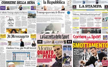 L'effetto legato ai dazi imposti da Trump che spaventa le Borse, con Wall Street che affonda, i risvolti della guerra in Ucraina con Zelensky che offre la tregua mentre gli Usa chiedono a Kiev "territori da cedere". Poi ancora la situazione medica legata a Papa Francesco, con il Pontefice che migliora e consente ai medici di sciogliere la prognosi ed il ritorno della Champions League. Questi i temi principali presenti sulle prime pagine dei quotidiani, oggi in edicola