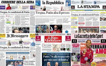 La guerra in Ucraina, con le richieste per la tregua avanzate da Vladimir Putin, il caso dei dazi americani che "scuotono" l'Ue, il terremoto ai Campi Flegrei e la riapertura del giallo legato alla morte di Chiara Poggi a Garlasco. Oltre che i risultati delle squadre italiane di calcio in Europa e le parole dei piloti della Ferrari alla vigilia dell'inizio del Mondiale di F1. Questi alcuni dei temi principali presenti sulle prime pagine dei quotidiani, oggi in edicola