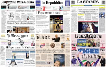Aperture dei giornali dedicate alle dimissioni del Papa, che stamattina si affaccerà dal Gemelli per l'Angelus e tornerà a Santa Marta per la convalescenza. Poi i piani di pace per l'Ucraina, con la Cina che valuta di unirsi ai "volenterosi" con l'invio di soldati per una tregua duratura. Domani i colloqui a Riad, giovedì il vertice su Kiev a Parigi (con la premier Meloni). Monito di Mattarella sui dazi: "Ci danneggiano". Infine, il trionfo di Brignone in Coppa del mondo generale di sci e discesa libera