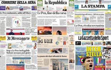La bufera politica in Francia con la condanna di Marine Le Pen per appropriazione indebita di fondi Ue, giudicata anche ineleggibile per l'Eliseo, l'impatto dei dazi Usa sulle Borse, il rogo di alcune Tesla a Roma ed il caso di una giovane 22enne accoltellata per strada a Messina. Questi alcuni dei principali temi presenti sulle prime pagine dei quotidiani, oggi in edicola