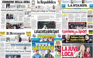 Dazi ancora protagonisti sulle aperture dei principali giornali, col pressing crescente negli Usa su Trump per rivedere la sua posizione sulle tariffe. Ma c'è anche la politica italiana a farla da padrona, con le mire di Matteo Salvini sul Viminale e l'irritazione degli alleati. Grande spazio alla visita a sorpresa di Papa Francesco, in piazza tra i fedeli a San Pietro, e alla domenica della Serie A col pari tra Roma e Juventus che precede il monday night di lusso Bologna-Napoli