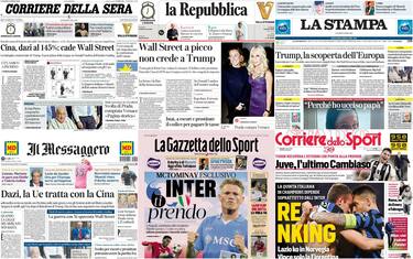 - Aperture ancora riservate ai dazi sulla quasi totalità dei giornali in edicola oggi. Sul Corriere della Sera spazio al crollo di Wall Street dopo le maxi tariffe imposte da Donald Trump alla Cina. Sul tycoon l'ombra dell'insider trading per un post prima della tregua. A centro pagina fotonotizia per la visita a sorpresa di Papa Francesco, senza l'abito talare bianco, ai restauratori della basilica di San Pietro