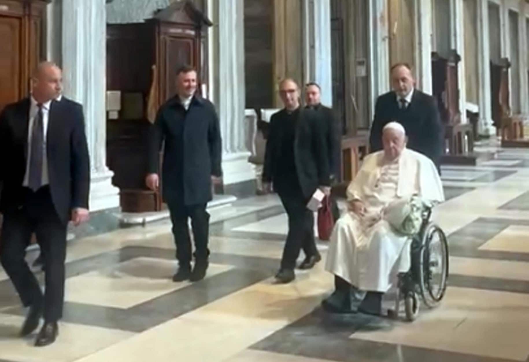 Vestito con la talare bianca e zucchetto alla testa, Bergoglio ha fatto il suo ingresso nella basilica di Santa Maria Maggiore in sedia a rotelle e portando un mazzo di rose bianche per un omaggio floreale alla Salus Popoli Romani, la più importante icona mariana che la tradizione attribuisce a San Luca, evangelista e patrono dei pittori. Papa Francesco aveva i naselli per l'ossigeno ma è apparso in buona forma ed è stato accolto dall'arciprete, il cardinale Rolandas Mackrikas. Per farlo accedere alla cappella è stata allestita una pedana. Il Pontefice è rimasto nella basilica circa un quarto d'ora.