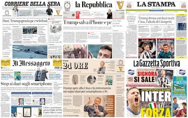 Aperture dei giornali dedicate alla guerra dei dazi, con Trump che si dice "ottimista" su un accordo con la Cina ed esenta dalle tariffe smartphone, pc e semiconduttori. Questione Ucraina, l'inviato Kellogg: "Ipotesi Kiev divisa in due parti come Berlino nel 1945". No di Mosca, poi la retromarcia: "Mie parole travisate". Corteo pro Palestina a Milano, scontri con le forze dell'ordine. Spunta anche la scritta "Spara a Giorgia". Giorgetti: "Il 2% del Pil in Difesa senza derogare al Patto"