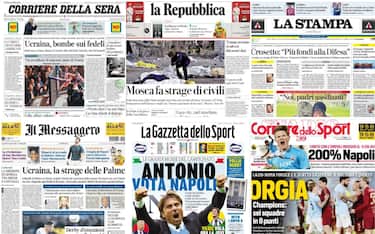Il conflitto russo-ucraino, con i missili russi che hanno fatto una strage sulla città di Sumy nella domenica delle Palme, quello in Medioriente, con il raid israeliano sull'ultimo ospedale di Gaza. E poi ancora il caos generato dai dazi americani e gli esiti della giornata di campionato, con gli scontri tra ultras e polizia prima del derby di Roma. Questi alcuni dei principali temi presenti sulle prime pagine dei quotidiani, oggi in edicola