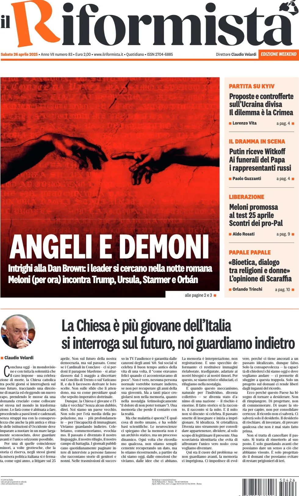 - L'incontro tra i leader mondiali a Roma in occasione dei funerali di Papa Francesco: "Angeli e demoni". "I leader si cercano nella notte romana: Meloni (per ora) incontra Trump, Ursula, Starmer e Orban". Spazio all'Ucraina: "Proposte e controfferte sull'Ucraina divisa: il dilemma è la Crimea". Poi le celebrazioni della Festa della Liberazione: "Meloni promossa al test 25 aprile. Scontri dei pro-Pal". L'editoriale di Claudio Velardi: "La Chiesa è più giovane dell'Italia: si interroga sul futuro, noi guardiamo indietro"