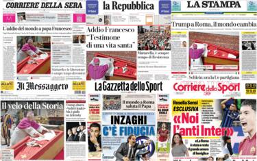 - In apertura i funerali di Jorge Mario Bergoglio oggi a San Pietro: "L'addio al papa della misericordia. Il mondo a Roma saluta Francesco". In prima pagina anche le parole del presidente Mattarella in occasione della Festa della Liberazione: "È sempre tempo di Resistenza". E quelle della premier Meloni: "Il regima fascista negò la libertà". Scoppiano "polemiche sui propal e la Brigata ebraica". L'editoriale di Gigi Riva su Ucraina e Gaza: "Se le stragi dei civili sono diventate accettabili"