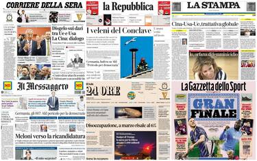 In apertura dei giornali, l'allarme degli 007 tedeschi su Afd: "Un pericolo per la democrazia". In Inghilterra, Reform Uk di Farage vola nelle Amministrative. Il principe Harry chiede una "riconciliazione" con la famiglia reale. Dazi, la Cina apre ai colloqui con gli Usa. Borse in rialzo, ma S&P rivede al ribasso il Pil mondiale. La premier Meloni punta al 2027: "Realizzo il mio programma e mi ripresento agli elettori". Conclave, conto alla rovescia: montato il comignolo da cui uscirà la fumata bianca