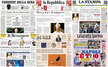 In apertura dei giornali il botta e risposta tra Kiev e Mosca. Zelensky avvisa i leader ospiti della parata russa del 9 maggio: "Non possiamo garantire la loro sicurezza". Il Cremlino: "Se succede qualcosa, vi cancelleremo". Si avvicina la partenza del Conclave, i cardinali chiedono più tempo per convergere su un nome. Trump pubblica sul social Truth una sua immagine vestito da Papa: ira dei vescovi americani. E dopo il Canada, l'effetto dei dazi premia la sinistra anche in Australia: vince il laburista Albanese