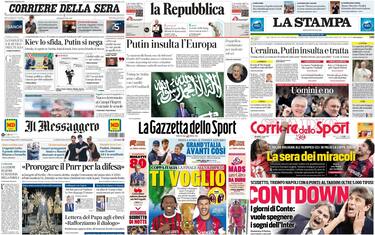 - 'Putin insulta l'Europa' scrive, invece, in prima La Repubblica, con riferimento alle sprezzanti parole pronunciate dal leader di Mosca, che ha definito le sanzioni verso la Russia "da deficienti". Macron: "Valutiamo ombrello nucleare in Europa". Anche qui in evidenza gli affari sauditi di Trump e la condanna a Gerard Depardieu per molestie sul set