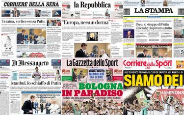 Il vertice di Istanbul tra Ucraina e Russia, ma senza la presenza di Putin, le parole di Mattarella e Draghi che "scuotono" l'Europa, l'incontro tra Sinner e Papa Leone XIV, gli ultimi sviluppi del caso Garlasco e la vittoria del Bologna in Coppa Italia ai danni del Milan. Questi alcuni dei temi principali presenti sulle prime pagine dei quotidiani, oggi in edicola