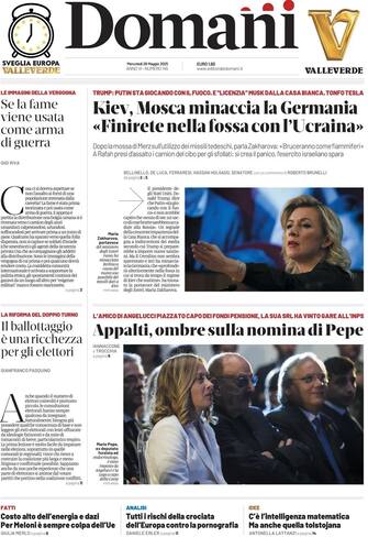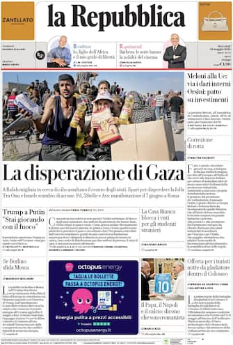 - In apertura la guerra in Ucraina: "Kiev, Mosca minaccia la Germania: 'Finirete nella fossa con l'Ucraina'". Intanto a Gaza, "presi d'assalto i camion del cibo per gli sfollati: si crea il panico, l'esercito israeliano spara". Il caso appalti: "Ombre sulla nomina di Pepe". In prima pagina anche la questione dazi: "Costo alto dell'energia e dazi: per Meloni è sempre colpa della Ue". L'editoriale di Gigi Riva: "Se la fame viene usata come arma di guerra". E quello di Gianfranco Pasquino: "Il ballottaggio è una ricchezza per gli elettori"