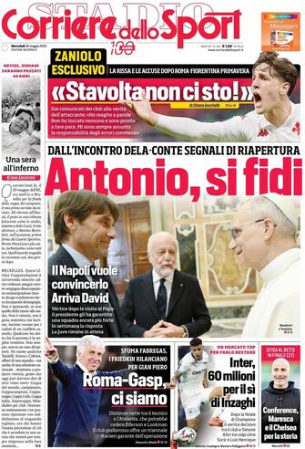 - In apertura l'incontro tra Conte e De Laurentiis: "Conte, si fidi". "Il Napoli vuole convincerlo, arriva David". Spazio anche all'intervista a Nicolò Zaniolo: "Stavolta non ci sto!". In prima pagina anche i nerazzurri: "60 milioni per il sì di Inzaghi". E poi, "Roma-Gasp, ci siamo". L'editoriale di Ivan Zazzaroni: "Una sera all'inferno"