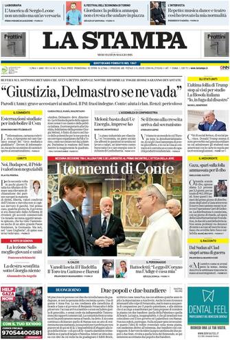 - La questione della giustizia domina l'apertura della Stampa: "Delmastro se ne vada". Scoppia la "bufera" sul sottosegretario Delmastro che aveva detto: "dopo le nostre riforme le toghe rosse saranno devastate". Negli Stati Uniti invece, Trump blocca i visti per gli studenti internazionali. Intanto, a Gaza "spari sulla folla ammassata per il cibo". Il reportage di Francesca Mannocchi: "Dal Sudan al Ciad stupri arma di guerra". In prima pagina, spazio anche al calcio con "i tormenti di Conte"