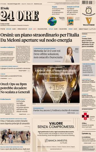 - La questione dazi in apertura: "Orsini: un piano straordinario per l'Italia. Da Meloni aperture sul nodo energia". In prima pagina anche l'export di vino in Italia: "Il Veneto resta al top: doppiate Toscana e Piemonte". Poi le parole di Roberta Metsola: "La Ue è con voi, deve offrire soluzioni, non ostacoli e burocrazia". Focus anche sulle banche: "Orcel: Ops su Bpm potrebbe decadere, no scalata a Generali". Poi, gli esteri con Medioriente: "Onu e Vaticano contro Israele: non rispetta principi di umanità", e Ucraina: "Trump: Putin gioca col fuoco"