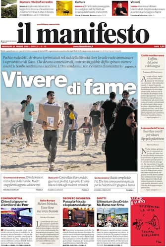 - "Vivere di fame". Questo il titolo d'apertura del Manifesto sulla crisi umanitaria a Gaza. "Arrivano i primi aiuti nel sud della Striscia dove Israele vuole ammassare i sopravvissuti di Gaza". Il Centrosinistra convoca una piazza per la Plestina il 7 giugno a Roma: "Basta complicità". Intanto, negli Usa il presidente Trump blocca il visto agli studenti stranieri. Spazio all'economia: "Chiesti al governo 24 miliardi dal Pnrr". L'editoriale di Tommaso Di Francesco: "L'offesa del pane e del sangue"