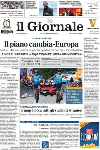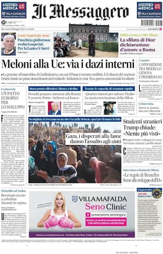 - La questione delle tariffe domina ancora l'apertura: "Il piano cambia-Europa". La premier Meloni: "Basta dazi interni per far ripartire l'economia". E arriva l'ok di Metsola. Spazio anche alla lotta di Trump contro gli studenti internazionali: "Trump blocca tutti gli studenti stranieri", "fermati i colloqui degli atenei, verranno analizzati i profili social". In prima pagina anche lo sport, con il Giro d'Italia: "Favola al Giro, due italiani per mano al traguardo". L'editoriale di Osvaldo De Paolini: "La doppia sfida delle imprese"