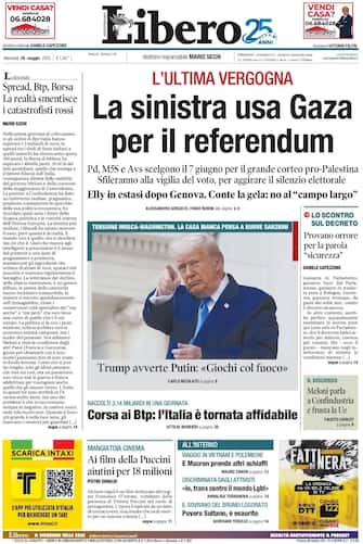 - "La sinistra usa Gaza per il referendum" è il titolo d'apertura di Libero sul corteo per Gaza organizzato da Pd, M5S e Avs per il 7 giugno. "Sfileranno alla vigilia del voto, per aggirare il silenzio elettorale", scrive ancora Libero. Dopo la vittoria del centrosinistra a Genova "Elly in estasi", ma "Conte la gela: no al 'campo largo'". Spazio poi alla guerra in Ucraina con il monito di Trump a Putin: "Giochi col fuoco". Poi l'economia: "Corsa ai Btp: l'Italia è tornata affidabile"