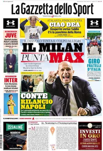 - "Il Milan punta Max" è l'apertura di oggi della Gazzetta. "Tare vuole superare la concorrenza ma deve fare in fretta". Spazio anche all'Atalanta: "Ciao Dea", "Gasperini verso l'addio, c'è la panchina della Roma". In prima pagina anche Antonio Conte, in visita dal Papa: "Rilancio del Napoli". Focus sulla Juve: "Giuntoli rischia, Poteri a Chiellini e spunta Comolli". Mentre l'Inter: "Fame Champions, in nove devono vendicare Istanbul". Infine, il Giro: "Fratelli d'Italia", "Scaroni-Fortunato più Pellizzari: è tris Del Toro in affanno"
