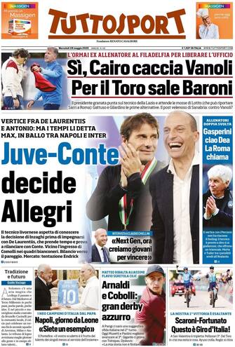 - L'incontro tra Conte e De Laurentiis in apertura: "Juve-Conte, decide Allegri". "Il Tecnico livornese aspetta di conoscere la decisione di Inzaghi prima di impegnarsi con De Laurentiis, che prende tempo e prova a rilanciare con Conte". Spazio anche all'Atalanta: "Gasperini, ciao Dea, la Roma chiama". Poi, il Torino: "Cairo caccia Vanoli". L'incontro tra la squadra del Napoli e il Papa: "Napoli, giorno da Leone". Poi, il tennis con il derby azzurro Arnaldi-Cobolli al Roland Garros. Infine, il ciclismo: "Scaroni-Fortunato, questo è Giro d'Italia!"