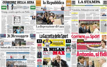 - In apertura la questione dazi: "Meloni: basta dazi interni Ue 'e ora misure sull'energia'". In prima pagina anche alla crisi umanitaria a Gaza: "Per il pane". "I palestinesi in fila per il cibo, in un video l'assalto della gente affamata al centro di distribuzione di Rafah". Sul fronte Ucraina, Trump: "Putin scherza col fuoco". Spazio anche all'intervista a Carlo Calenda: "Uniti si vince? Genova non è l'Ohio d'Italia". Caso Garlasco: "Stasi disegnò la scena del delitto". E ancora cronaca, con il benzinaio ucciso a coltellate ad Ardea