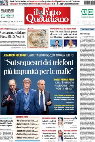 - "Sui sequestri dei telefoni più impunità per le mafie" è l'apertura del Fatto Quotidiano sulle parole di Giovanni Melillo. Spazio anche alla crisi umanitaria a Gaza: "Guerra sulla fame, piazza Pd-5S-Avs il 7.6". La questione difesa, con la Nato: "Più soldi alle armi, entri pure l'Ucraina". La presidente del Parlamento europeo: "Metsola sponsor dei nostri colossi degli armamenti". L'editoriale di Marco Travaglio: "È stata la mano di Putin"